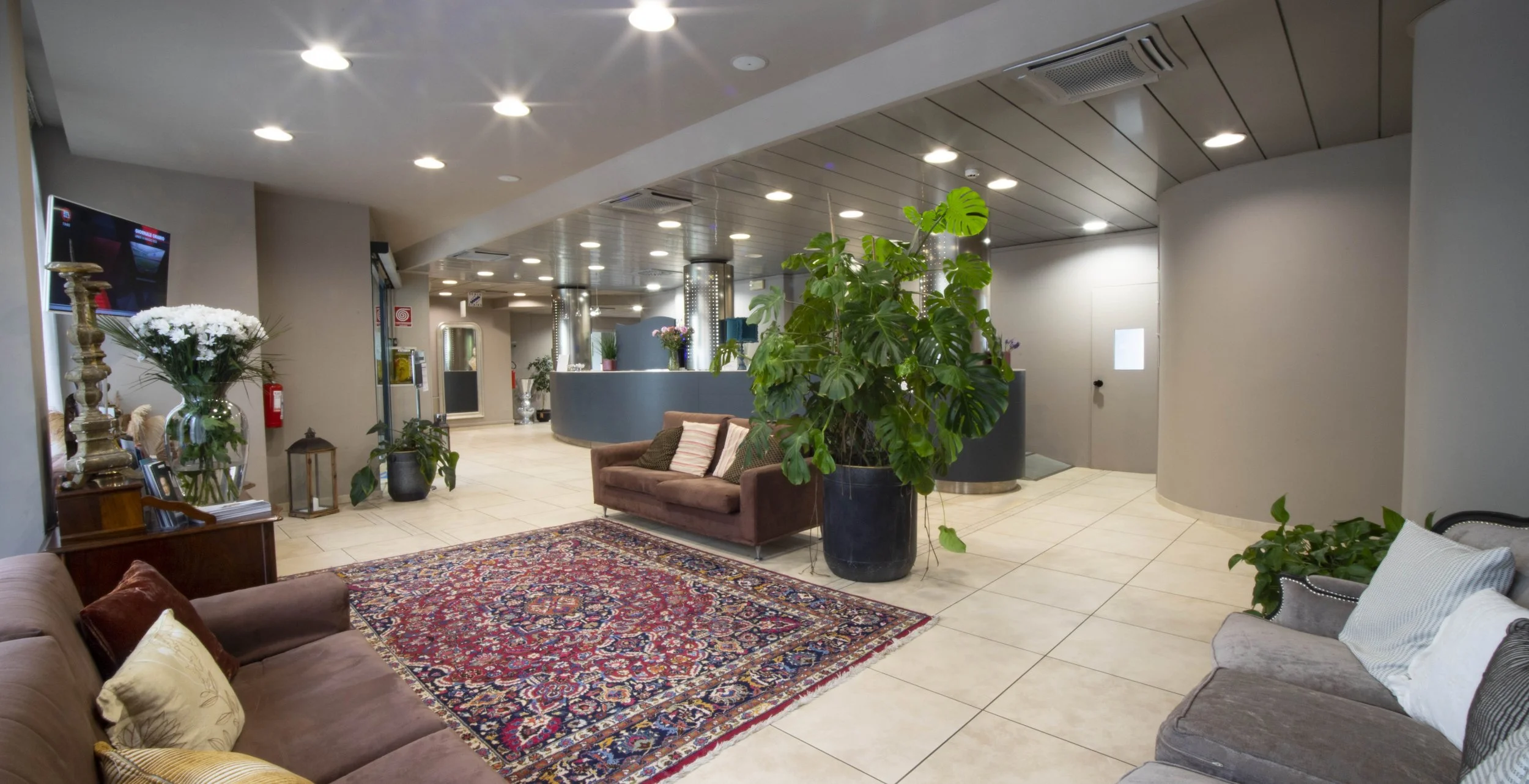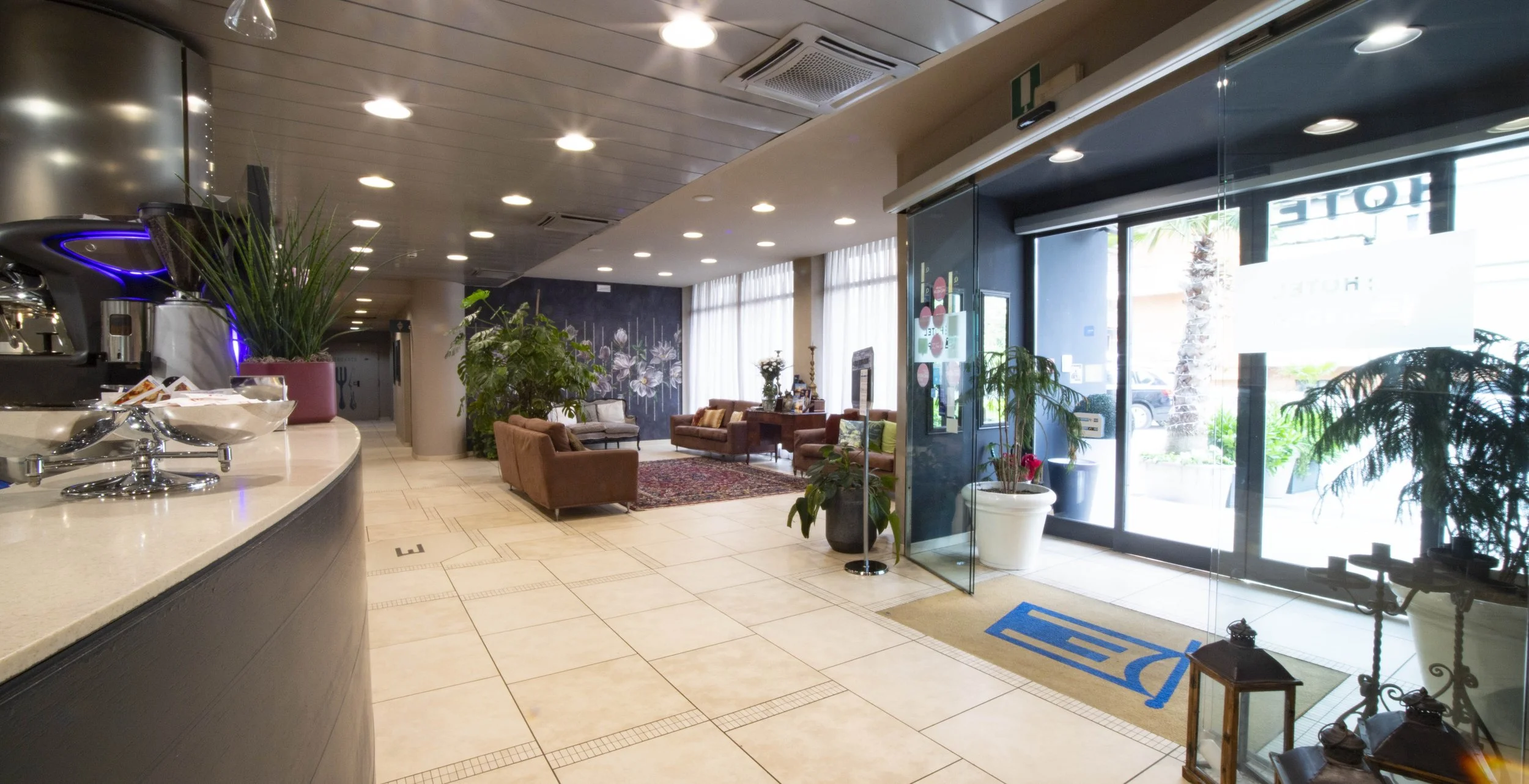 • Reception dell'hotel con bancone curvo, pianta con fiori, vetri con premi e riconoscimenti, spazi accoglienti.
